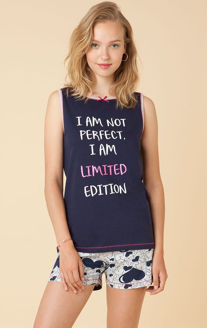 Женская трикотажная пижама из хлопка. Гладкая майка без рукавов с графическим принтом и контрастные набивные шорты. В комплекте: майка, шорты.