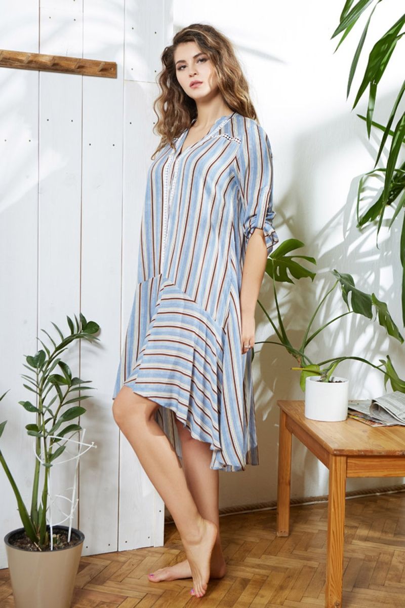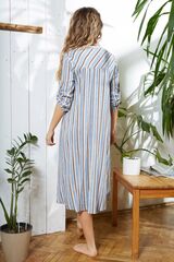Туника домашняя женская выполнена из принтованной вискозы. Модель свободного силуэта длиной миди. Рукав изделия прямой до запястья с хлястиком для регулировки длины. Фигурный вырез горловины с планкой-застежкой на пуговицах до талии. В боковых швах изделия разрезы.