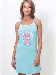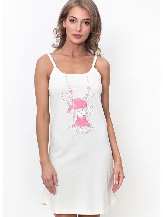 Женская туника с изображением зайчика с букетом ромашек. Тонкие бретели красиво открывают шею и плечи. Короткая юбка удобна для сна или активных домашних дел. Ткань полностью хлопковая, впитывает пот и позволяет коже дышать.
