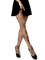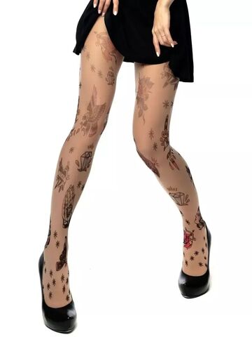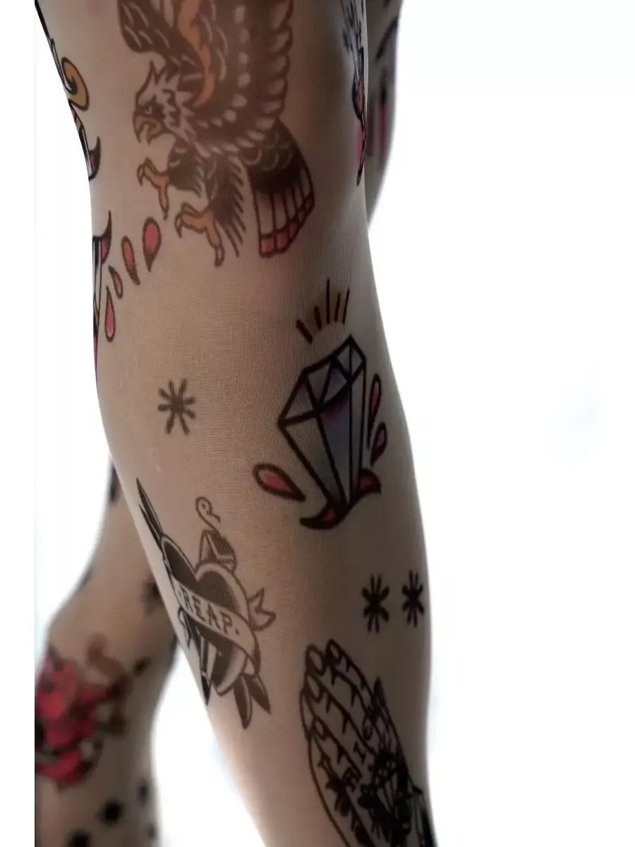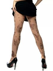 Женские колготки с принтом, имитирующим татуировки. Принт не стирается, не выгорает со временем. Можно стирать в стиральной машине. Крепкие, подойдут на рост от 145 до 180 см. Плотность - 40 ден.