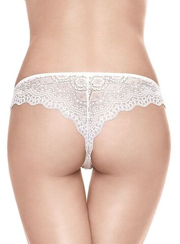 Трусики-бразилиана из кружева с геометрическим рисунком со стилизованными цветочными мотивами. Отсутствует эластичная кайма-резинка по бедру. Декорирован фирменным бирюзовым бантиком Infiore.