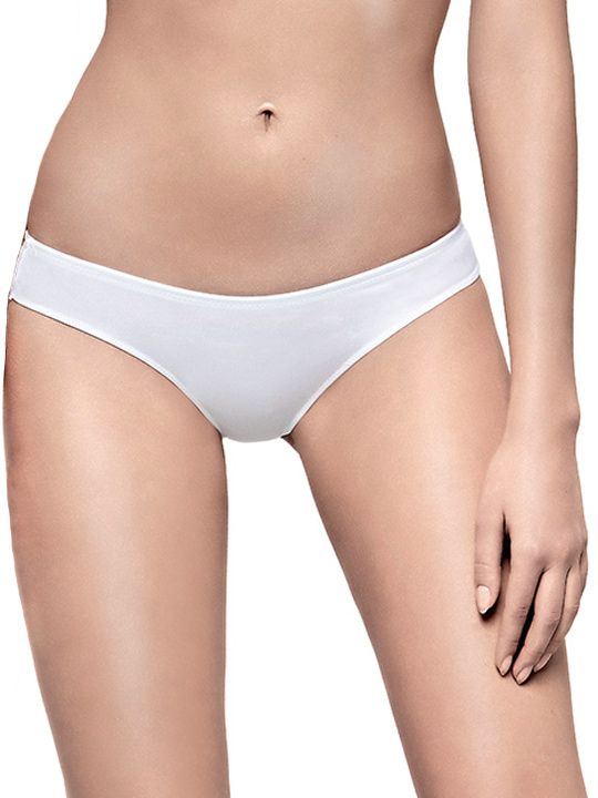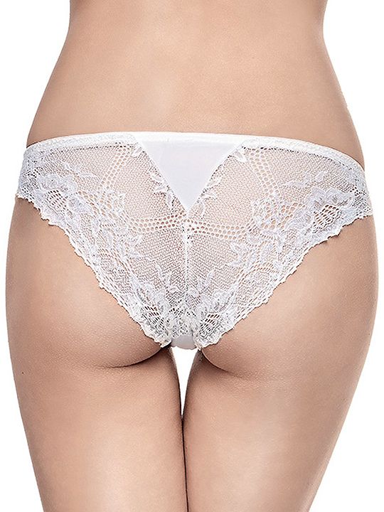 Трусики-бразилиана с низкой линией талии. Передняя деталь выполнена из гладкого эластичного полотна с микрофиброй, задняя - из эластичного кружевного полотна с цветочным рисунком. Верхний срез обработан тонкой тесьмой. Срез проймы передней детали отделан эластичной лентой на плоскошовной машине; срез проймы задней детали кружевной. Ластовица из хлопка.
