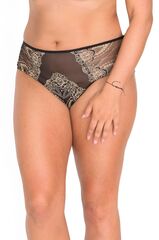 Женские трусики выполнены из сетки с вышивкой бежевой и черной нитью, спинка из сложенной вдвое сетки, ластовица проложена 100% хлопком. Идеальный вариант для повседневной носки.