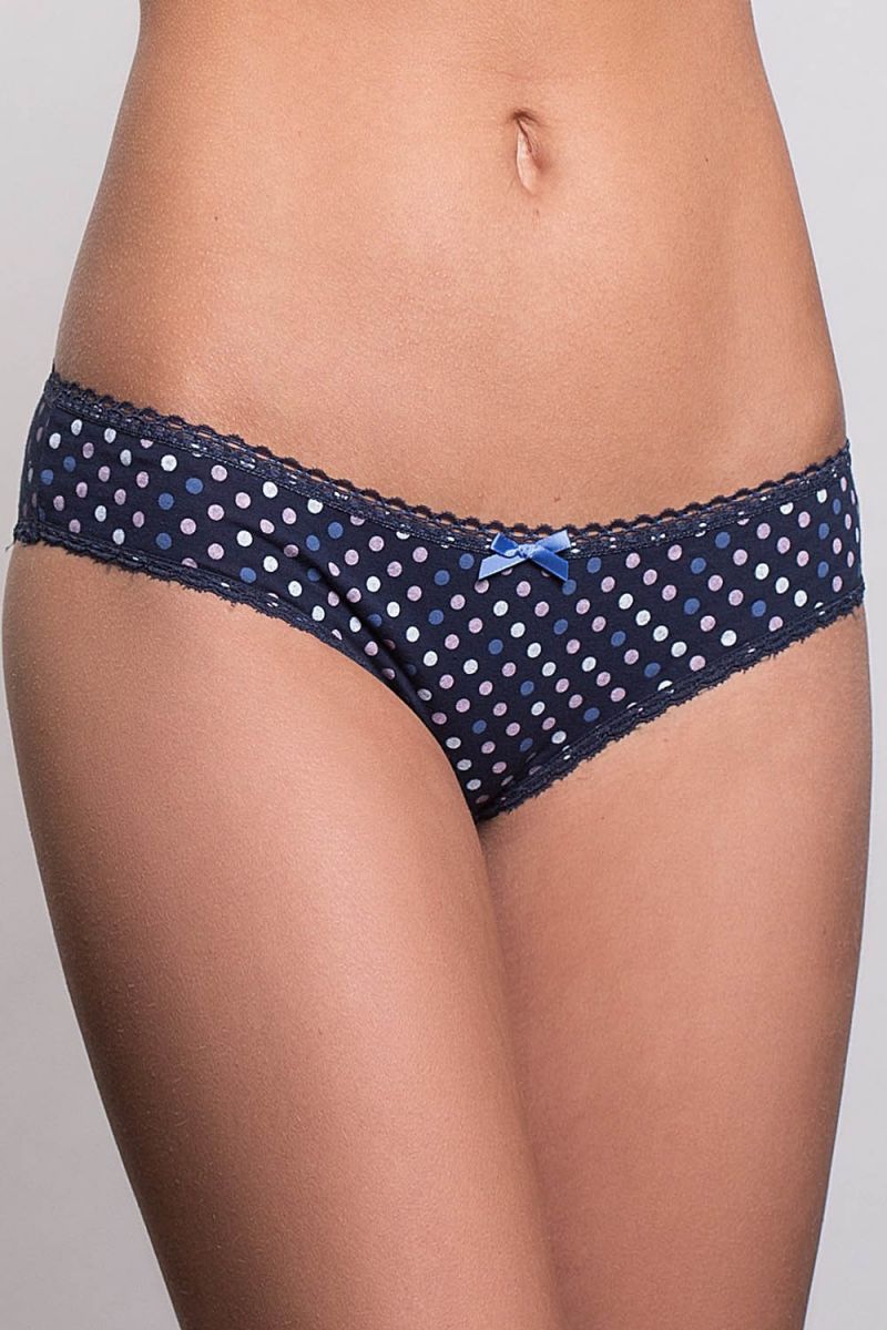 Хлопковые женские трусы-слипы в мелкий разноцветный горошек. Все срезы декорированы отделкой с ажурным краем.