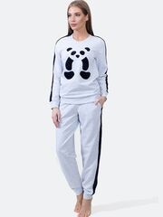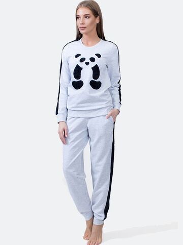 Трикотажный байковый комплект. Свитшот из однотонной ткани с принтом, с длинным рукавом, с лампасами, брюки свободного покроя, на манжете с лампасами. В комплекте: свитшот, брюки.
