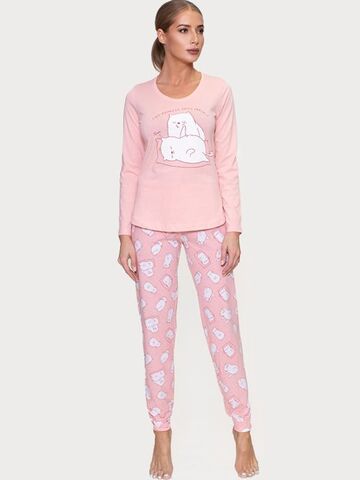 Трикотажный комплект. Футболка с длинным рукавом, однотонная, впереди с принтом, брюки прямого покроя, внизу на манжете с рисунком. В комплекте: футболка, брюки.