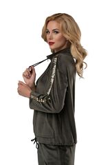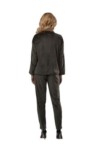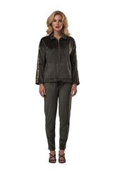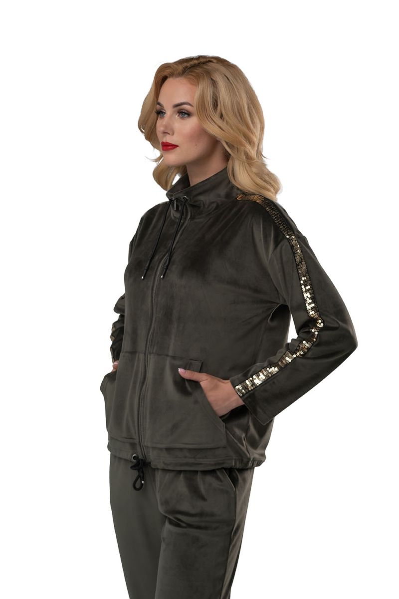 Комфортный женский костюм. Свободная куртка с удобными карманами-кенгуру выглядит эффектно из-за линии плеча, украшенной лентой из пайеток. Удобные брюки средней посадки заужены книзу. Костюм подойдет для дома и активного отдыха. В комплекте: куртка, брюки.