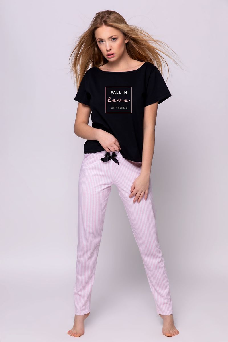 Хлопковая пижама Billie состоит из футболки с надписью на груди и полосатых брюк. Футболка свободного кроя с короткими рукавами и круглым вырезом горловины. Брюки на мягкой резинке, украшены атласным бантиком. В комплекте: футболка, брюки.