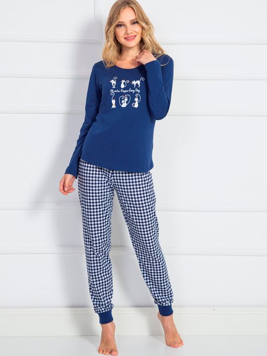 Трикотажный комплект. Футболка из однотонной ткани с принтом, с длинными рукавами, брюки свободного покроя в клетку, на манжетах В комплекте: футболка, брюки.