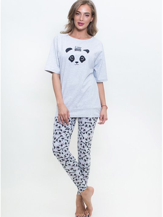 Домашний комплект из 2 предметов. Верх набора - туника светлого оттенка с принтом панды на груди. Модель имеет рукава реглан и круглый вырез горловины. Туника имеет свободный широкий фасон. Низ набора - лосины с узором по всему полотну. В комплекте: туника, лосины.