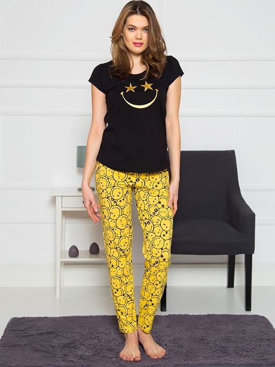 Комплект для отдыха дома. Верх набора - футболка с круглым вырезом и короткими рукавами, на груди которой смайлик. Низ - свободные брюки в смайликах. Модель снабжена эластичным поясом на талии. В комплекте: футболка, брюки.