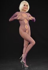 Женский фиолетовый кэтсьюит с фигурными вырезами по центру.