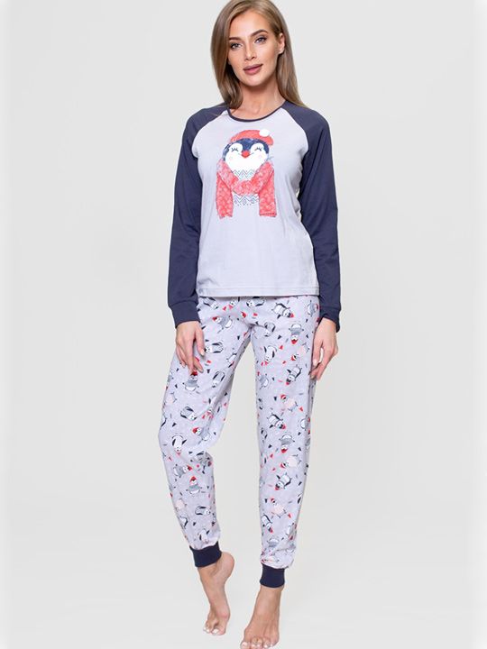 Трикотажный комплект. Футболка комбинированная из двух цветов, с длинным рукавом, покроя реглан, однотонная, впереди с принтом, брюки прямого покроя, внизу на манжете с рисунком. В комплекте: футболка, брюки.