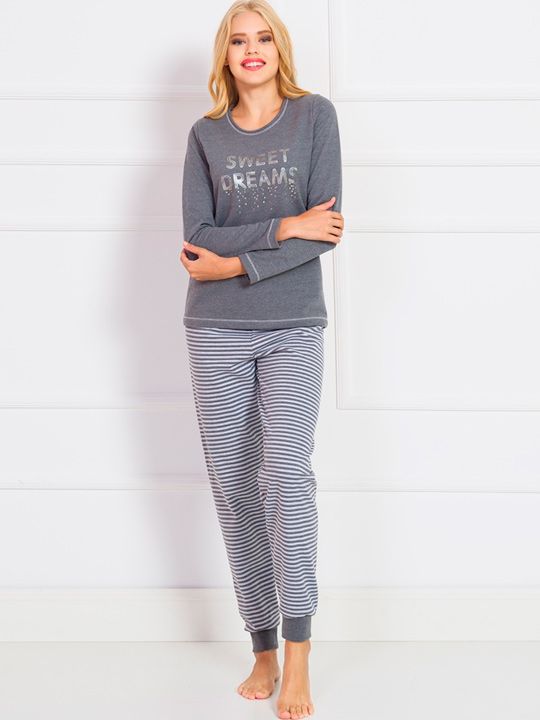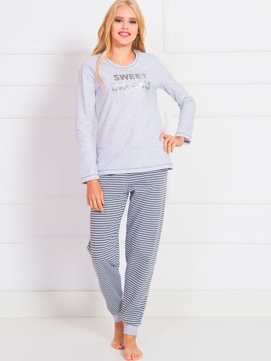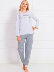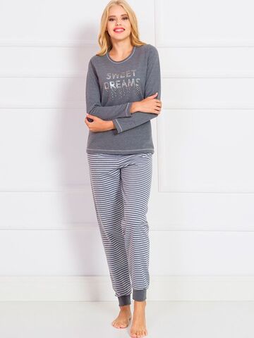 Трикотажный комплект. Футболка из однотонной ткани с принтом, с длинными рукавами, брюки свободного покроя в полоску, на манжетах. В комплекте: футболка, брюки.
