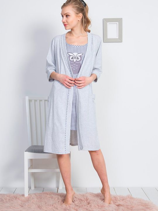 Трикотажный комплект - халат на запахе с поясом, рукав 3/4 однотонный, туника на бретельках, с рисунком. В комплекте: халат, туника.