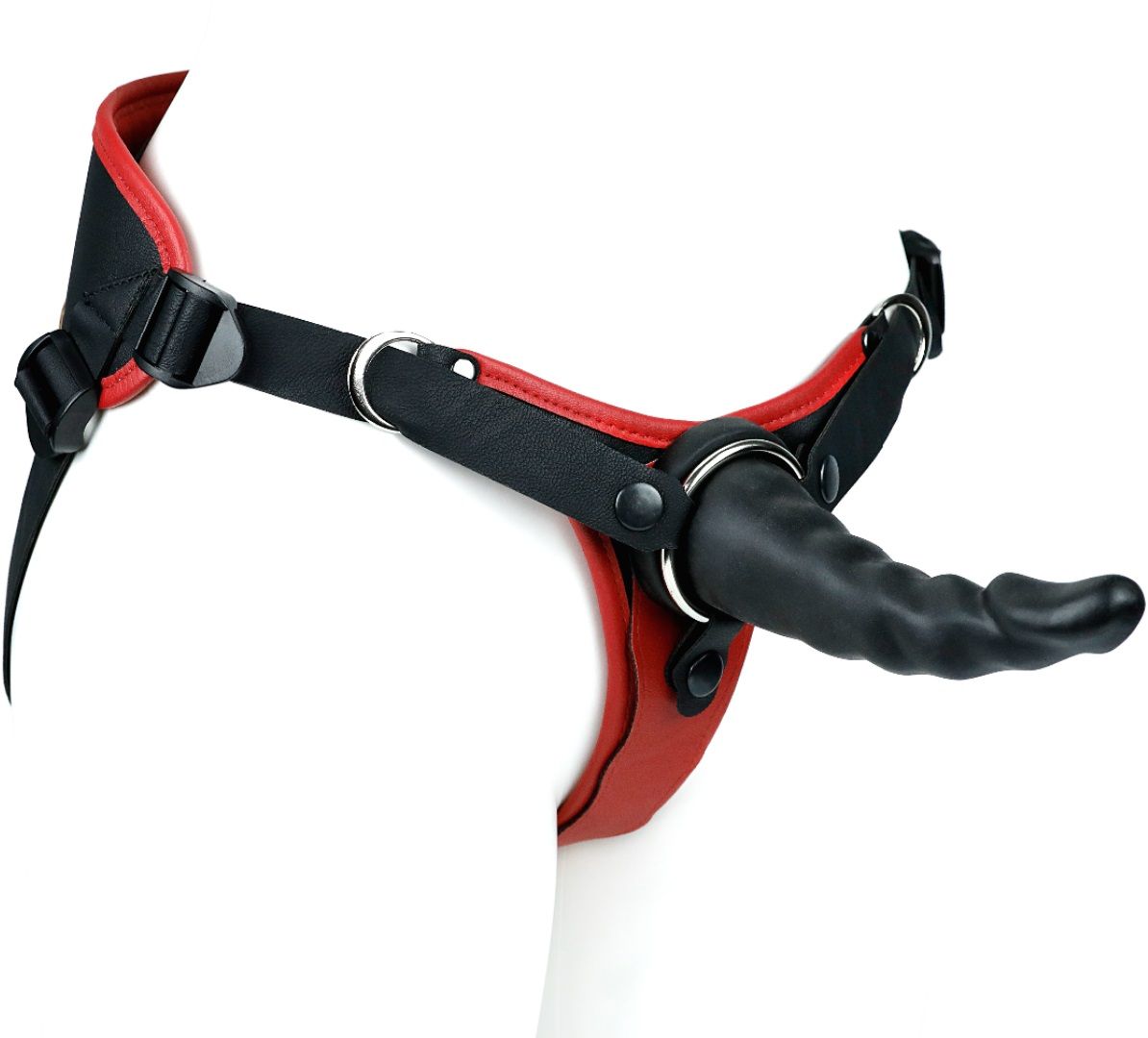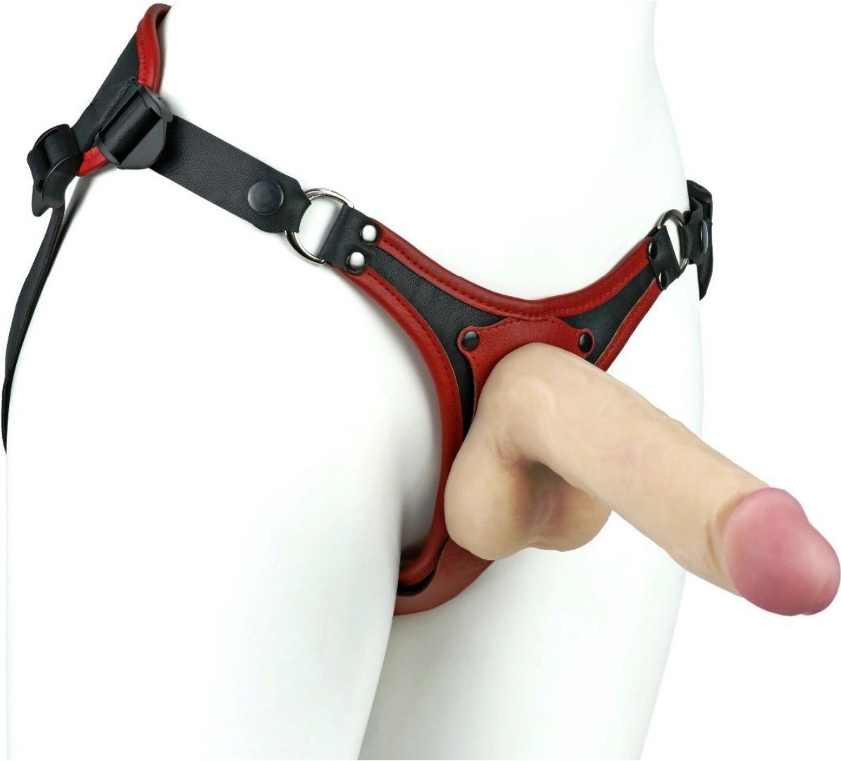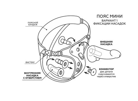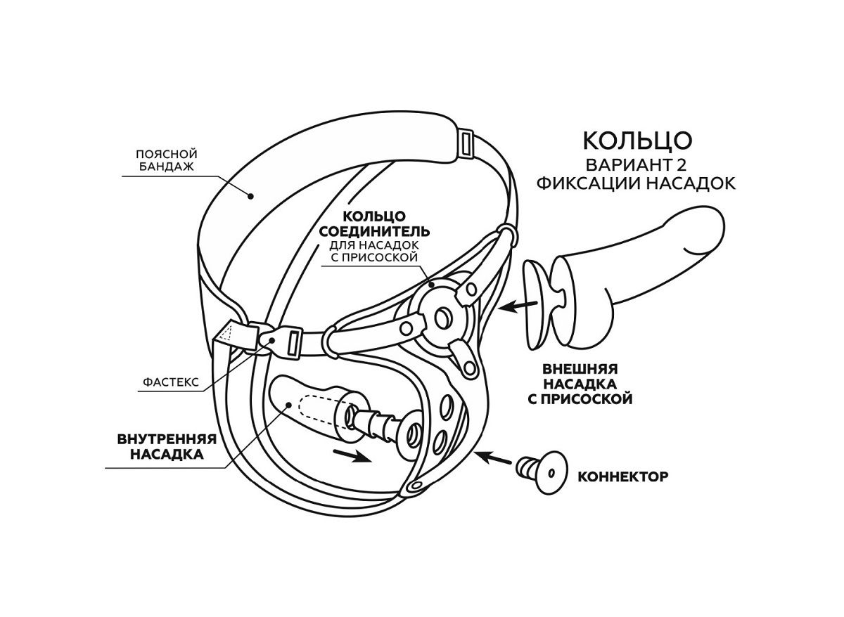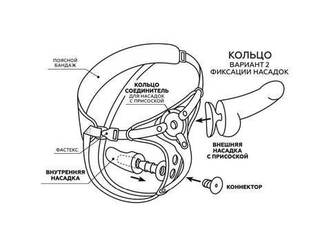 Можно зафиксировать кольцом любой фаллоимитатор на присоске (2 кольца в наборе комплекта с разными диаметрами). Для смены колец – необходимо расстегнуть кнопки ремней вокруг отверстия и поставить подходящее по размеру кольцо.