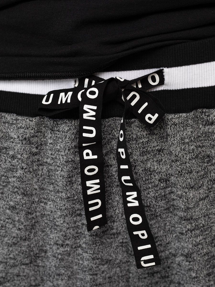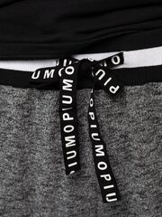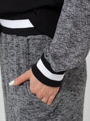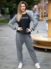 Женский спортивный костюм свободного силуэта: брюки на резинках и свитшот. Брюки выполнены из тонкого меланжевого трикотажа с содержанием вискозы, благодаря которой они необычайно мягкие и приятные к телу. Удобные боковые карманы, широкий пояс с кулиской и продернутой в нее брендированной корсажной лентой. Свитшот с рукавами - реглан из ткани как брюки, а основная часть его скроена из гладкого, утепленного с изнаночной стороны трикотажа. Прорезиненные буквы логотипа контрастного белого цвета на груди освежают образ. В комплекте: свитшот, брюки.
