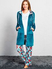Комплект из трех изделий. Халат из однотонной ткани на молнии, с отложным воротником и карманами. Свитшот из однотонной ткани с принтом, брюки прямого покроя из ткани с рисунком. В комплекте: халат, свитшот, брюки.