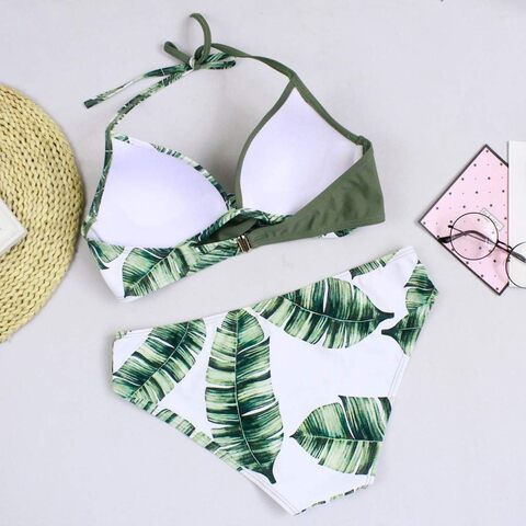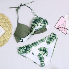 Женский зелено-белый раздельный купальник с растительным принтом. Купальник выполнен из мягкого, быстро сохнущего полотна с принтом. Состоит из бюстгальтера и трусов. Бюстгальтер с формованными чашками без косточек. Обеспечивает комфортную, мягкую посадку. Бретели завязываются вокруг шеи. Застёжка сзади. Трусы средней посадки. В комплекте: лиф, плавки.