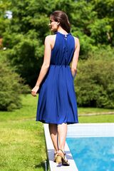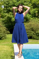 Женственное, легкое платье выполнено из тонкой, натуральной вискозы. Платье без рукавов, свободного кроя, длиной чуть ниже колен. Свободный крой выигрышно скроет недостатки фигуры. Ширина наряда по талии регулируется при помощи тонкого пояса.