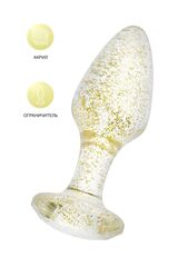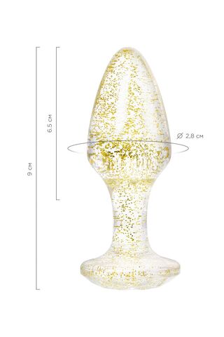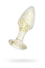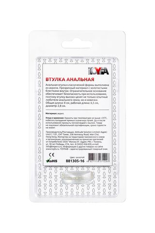 Анальная втулка классической формы выполнена из акрила. Прозрачный материал с золотистыми блестками внутри. Ограничительное основание обеспечивает безопасность при использовании, поэтому втулку высоко ценят не только опытные любители анального секса, но и новички. Рабочая длина - 6,5 см.