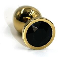 Золотая анальная пробка из алюминия размер M. Страз в основании круглой формы, выполнен из стекла черного цвета. Упакована в вельветовый мешочек для хранения. Вес - 82,5 гр.