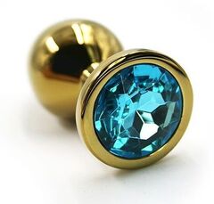 Золотая анальная пробка из алюминия размер M. Страз в основании круглой формы, выполнен из стекла голубого цвета. Упакована в вельветовый мешочек для хранения. Вес - 82,5 гр.