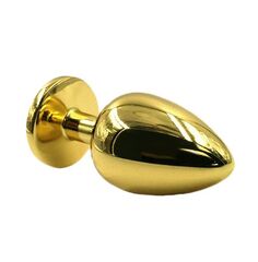 Золотая анальная пробка из алюминия размер S. Страз в основании круглой формы, выполнен из стекла светло-розового цвета. Упакована в вельветовый мешочек для хранения. Вес - 52 гр.