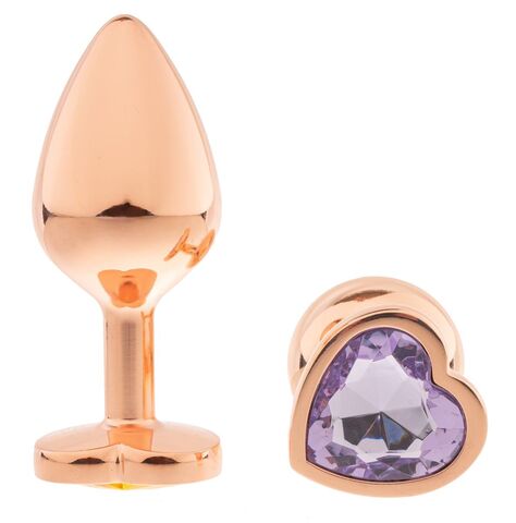 Золотистая анальная пробка OYO с сиреневым кристаллом-сердцем - 7,3 см.