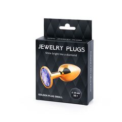 Золотистая анальная пробка с фиолетовым стразом - 7,2 см.