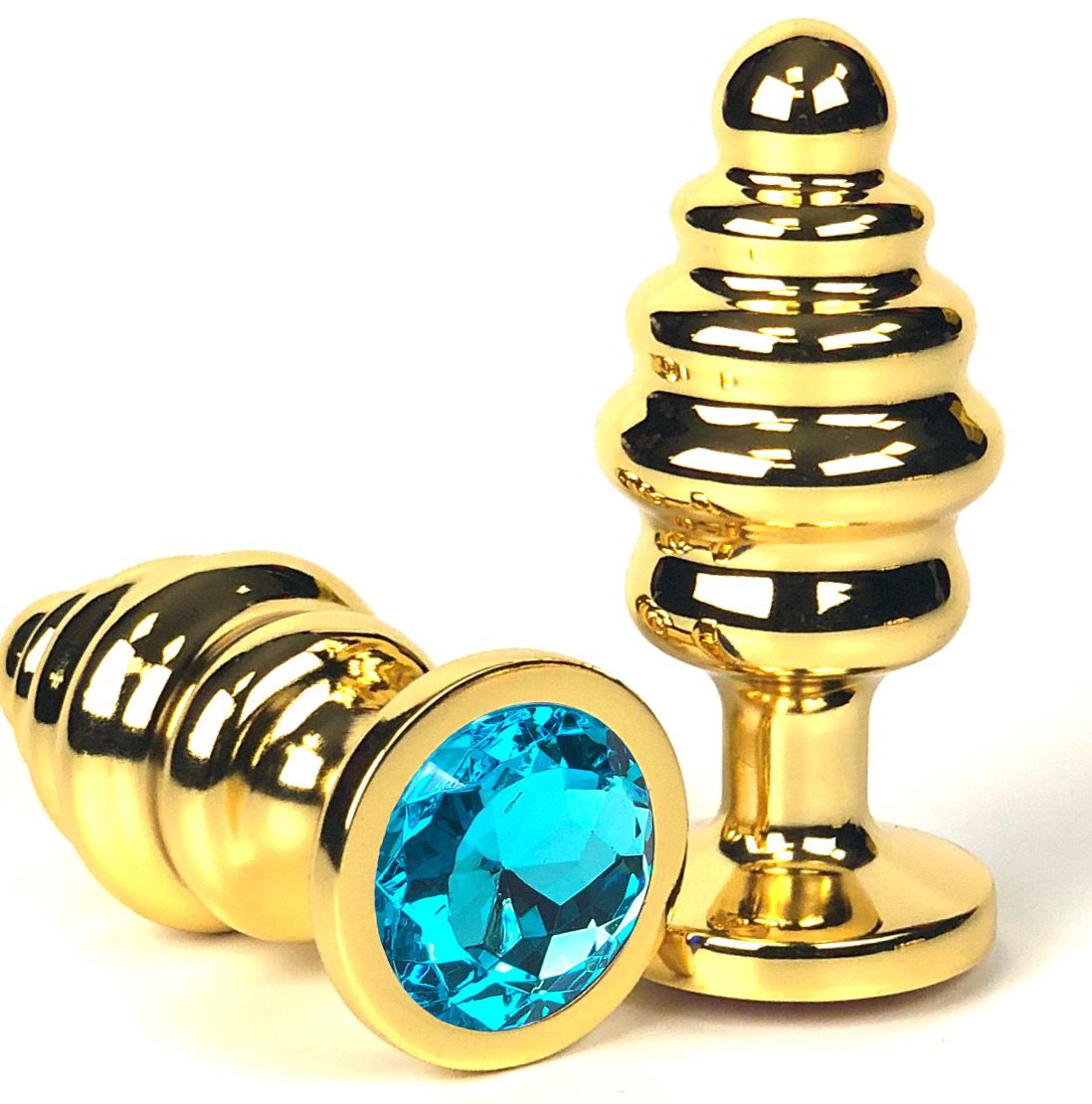 Золотистая ребристая анальная пробка с голубым кристаллом - 7 см.