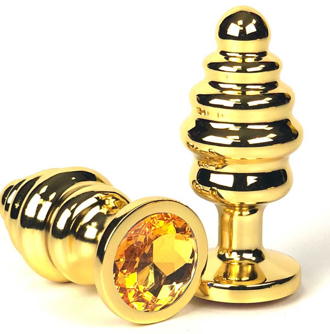 Золотистая ребристая анальная пробка с оранжевым кристаллом - 8,5 см.