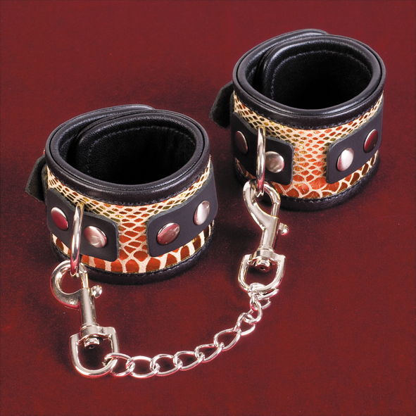 Широкие кожаные наручники под змеиную кожу со стильными карабинами и цепочкой.